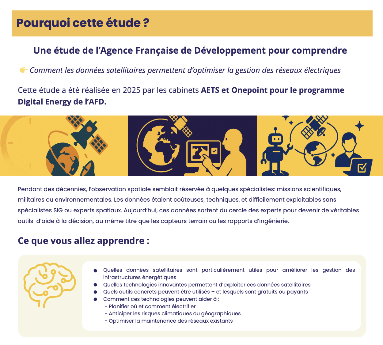 Ce rapport rend compte de la la première étude thématique lancée en 2023, consacrée aux « Technologies innovantes autour des données géosatellitaires pour l’amélioration de la gestion des réseaux électriques. » Il s’inscrit plus largement dans les travaux de Digital Energy sur la « Gestion efficace des Réseaux ». Onepoint et AETS ont été chargés de la réalisation de cette étude par l’Agence française de développement.